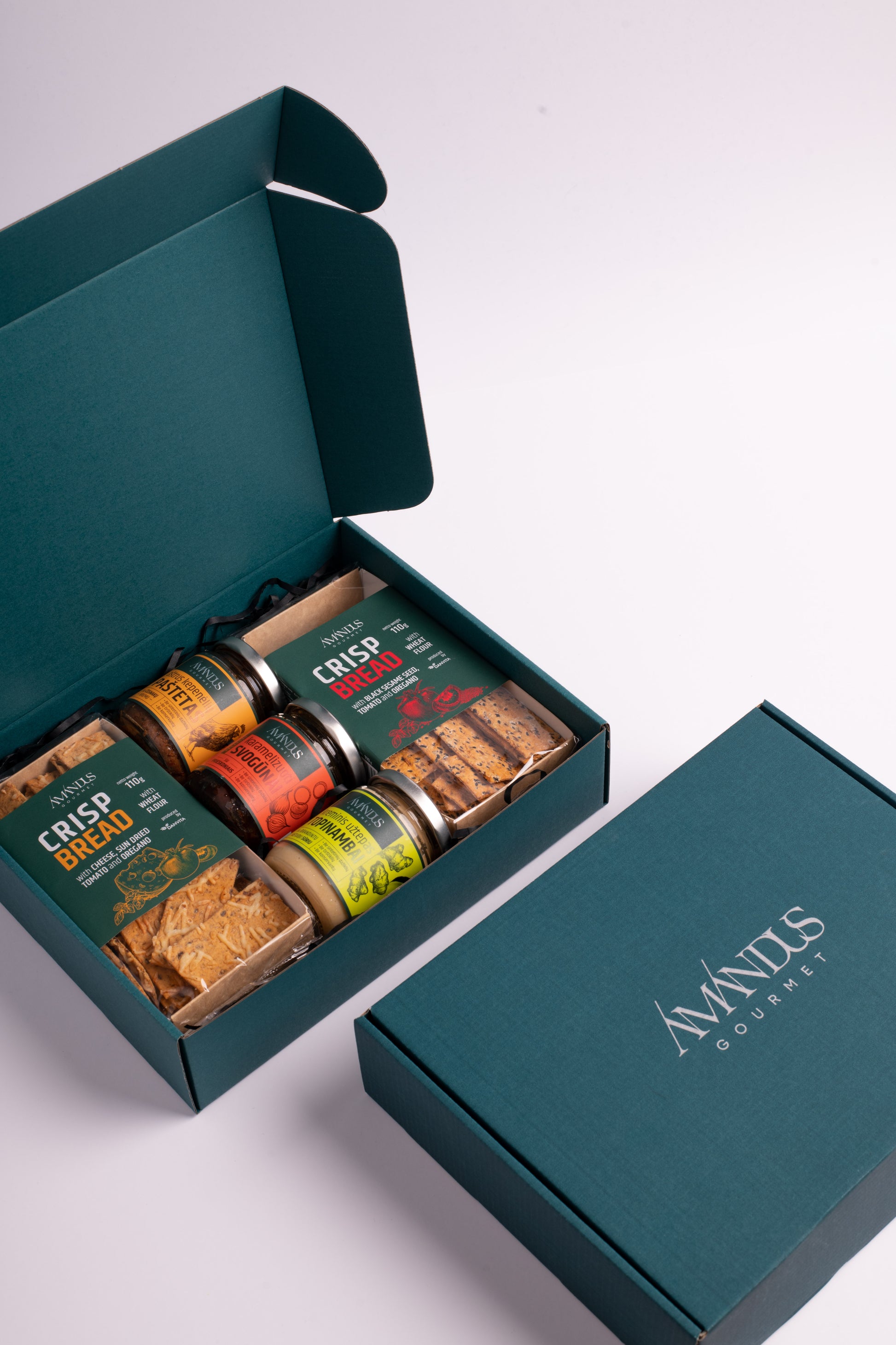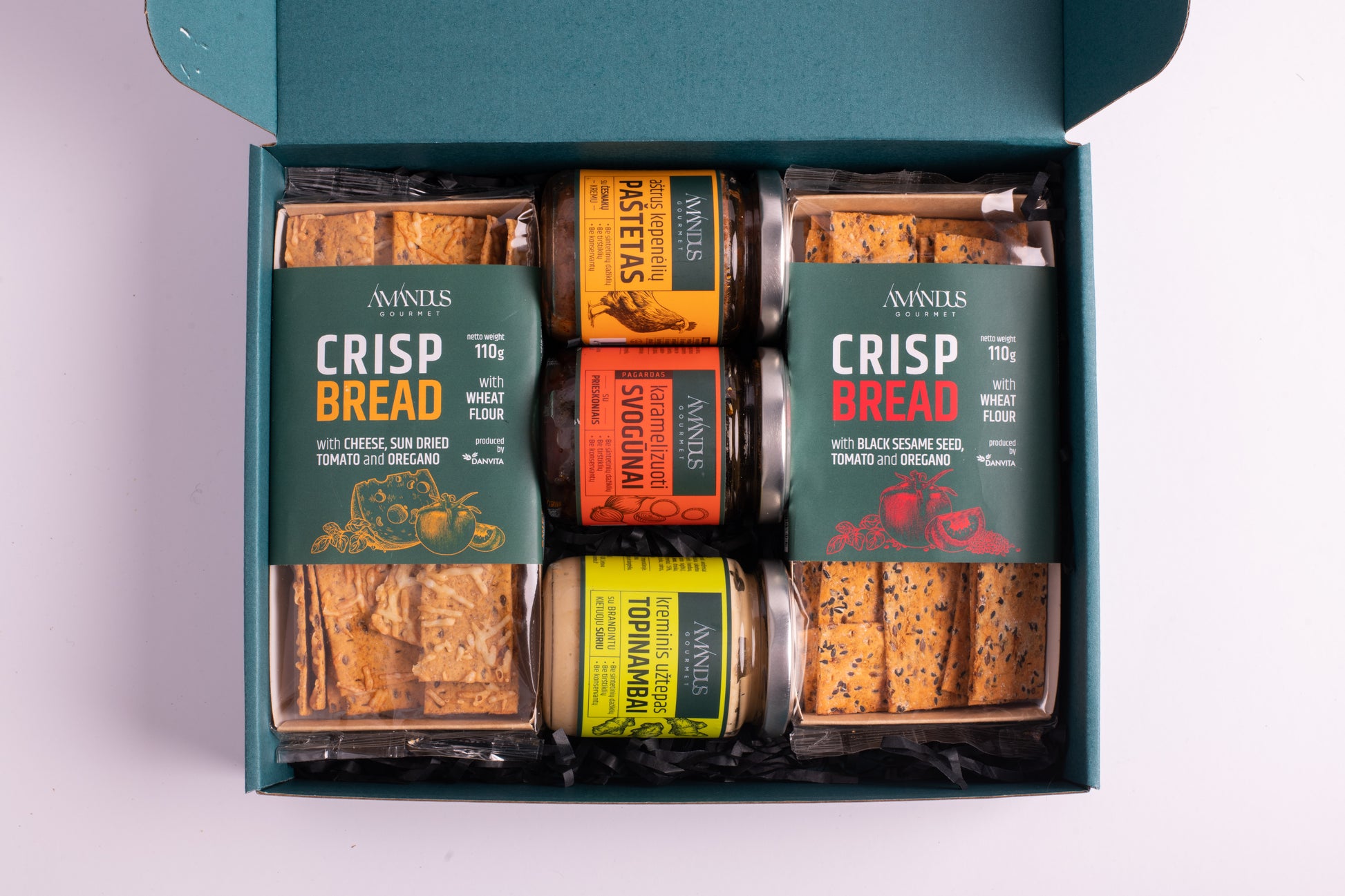 An exclusive gourmet set that combines three rich condiments and two packets of crispy bread. It's the perfect combination for a quick but gourmet snack — the creamy condiments and crispy bread complement each other and make it easy to create a small feast of taste anywhere, anytime.